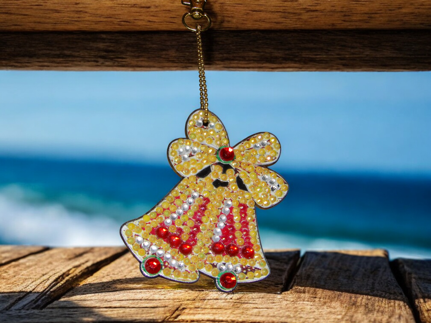White and red Santa Clause keychain hanging from a wooden surface with a blurred ocean background