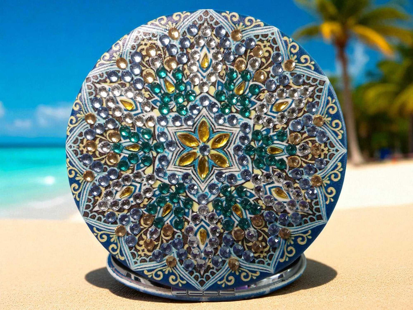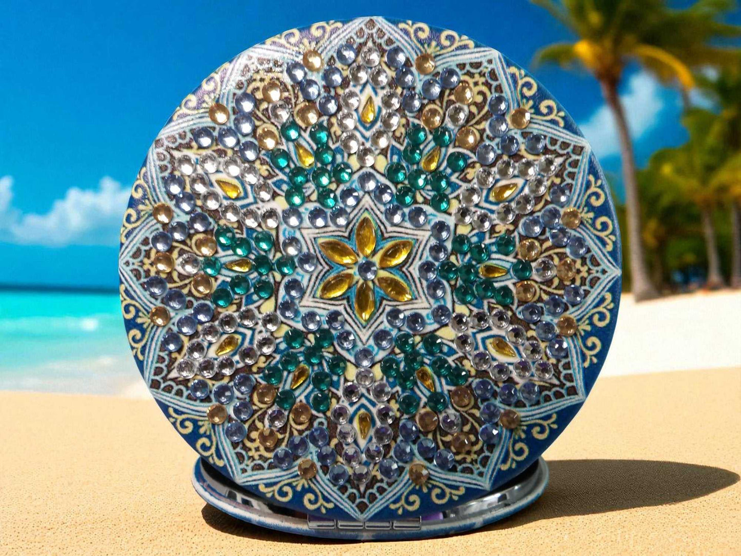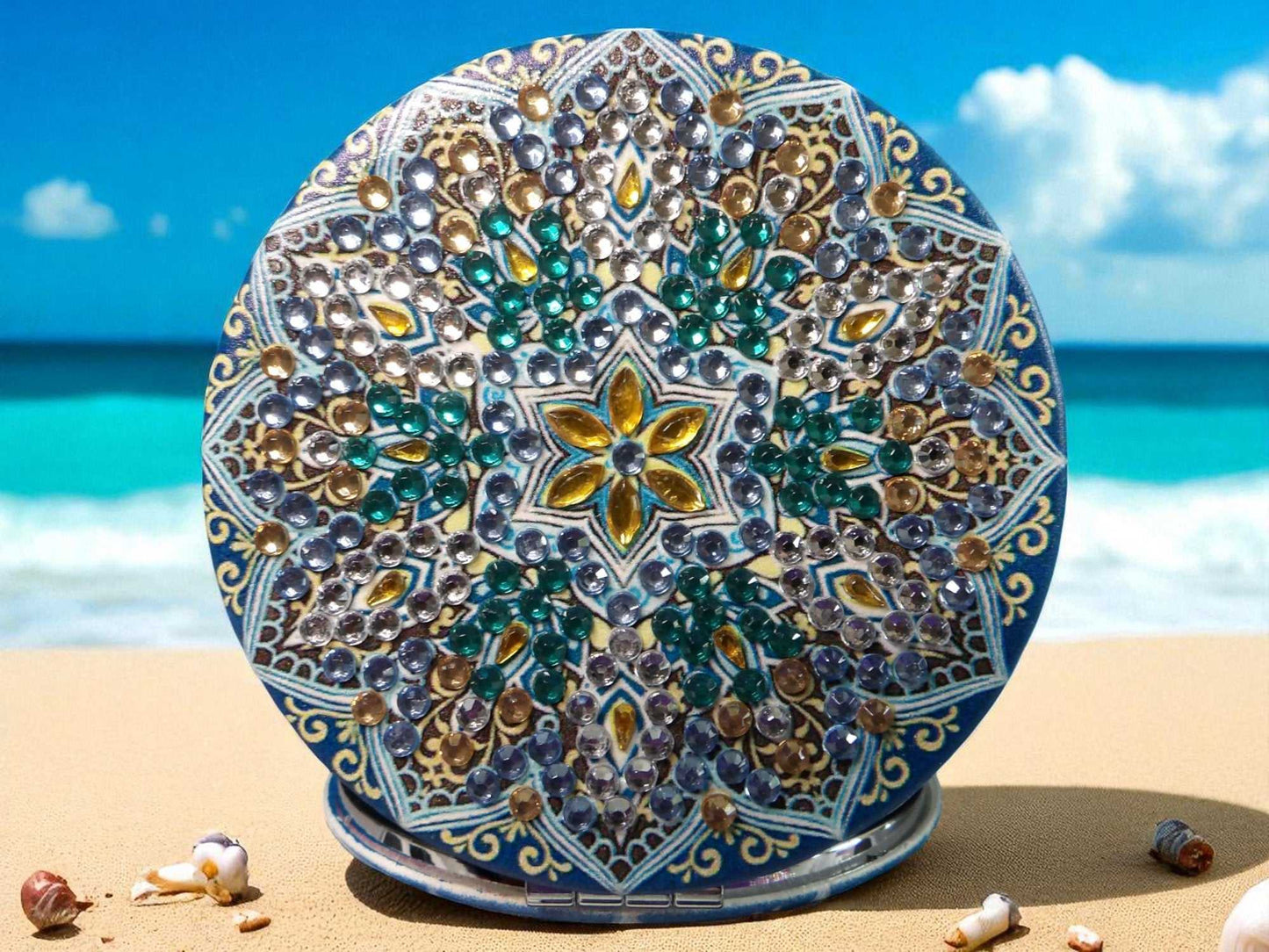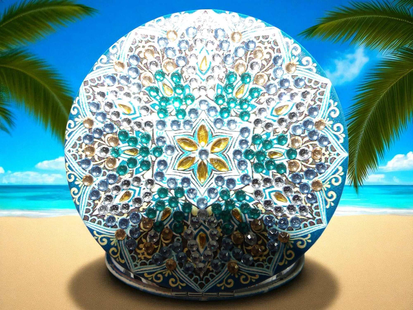 White and red Santa Clause keychain hanging from a wooden surface with a blurred ocean background