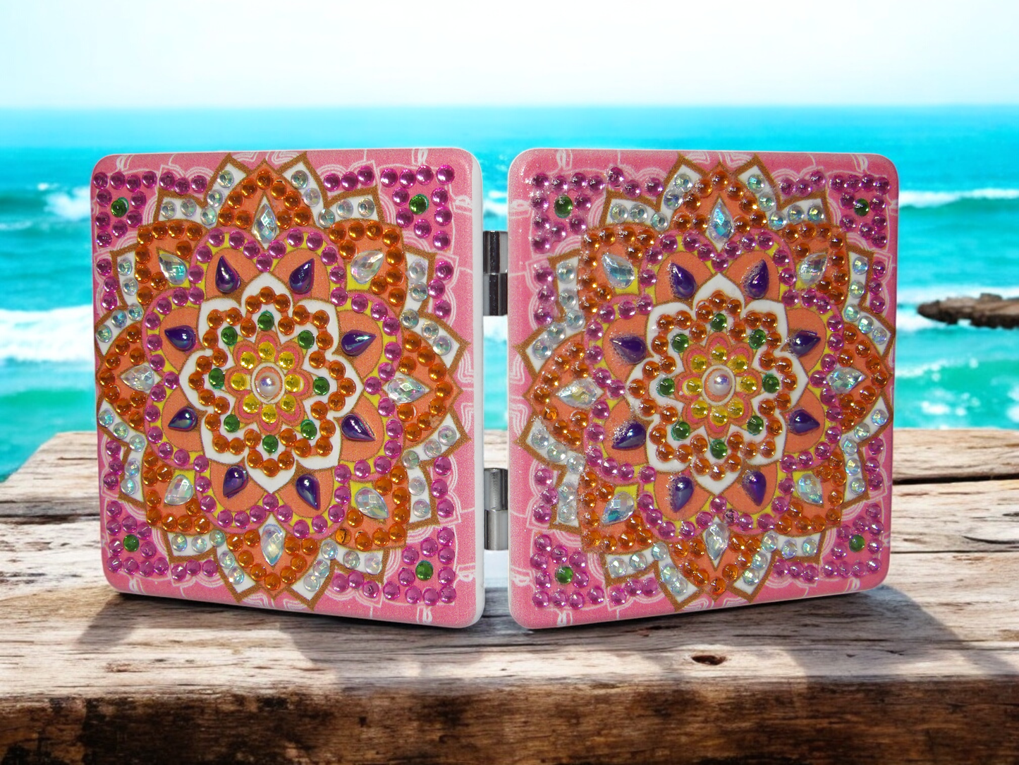 White and red Santa Clause keychain hanging from a wooden surface with a blurred ocean background