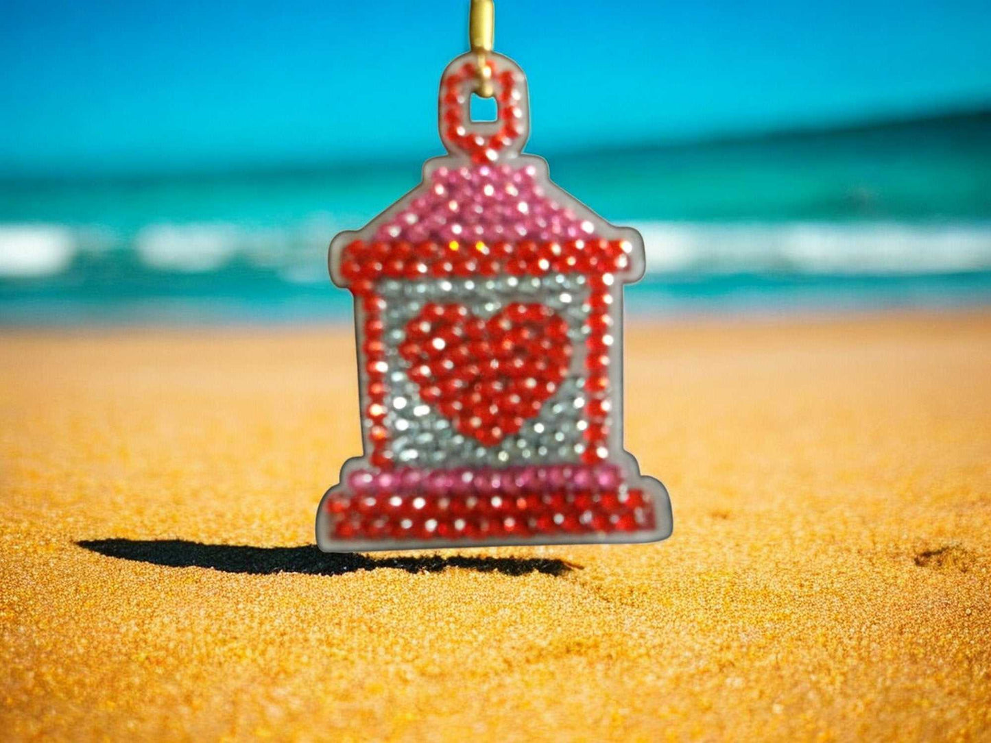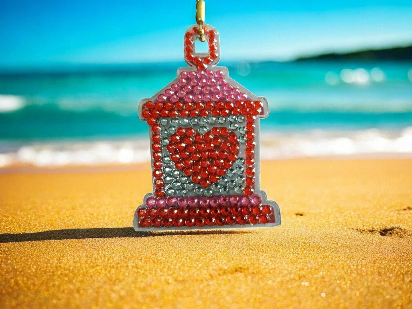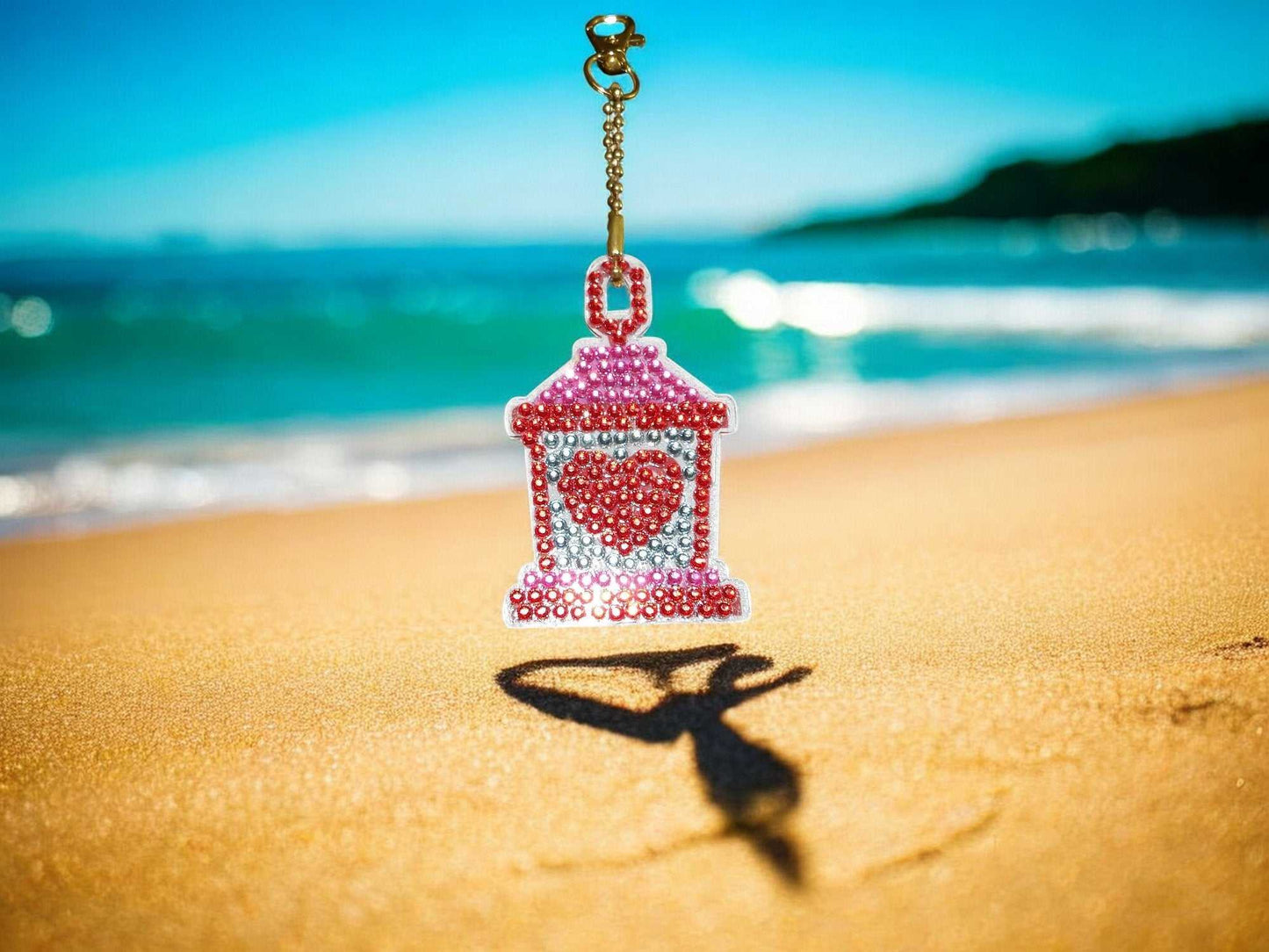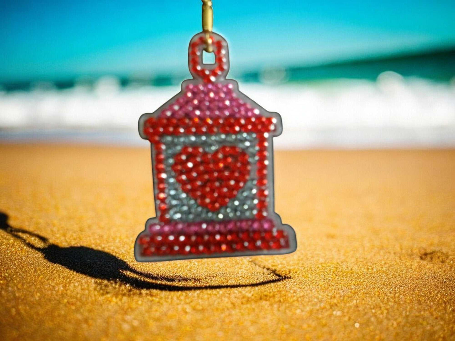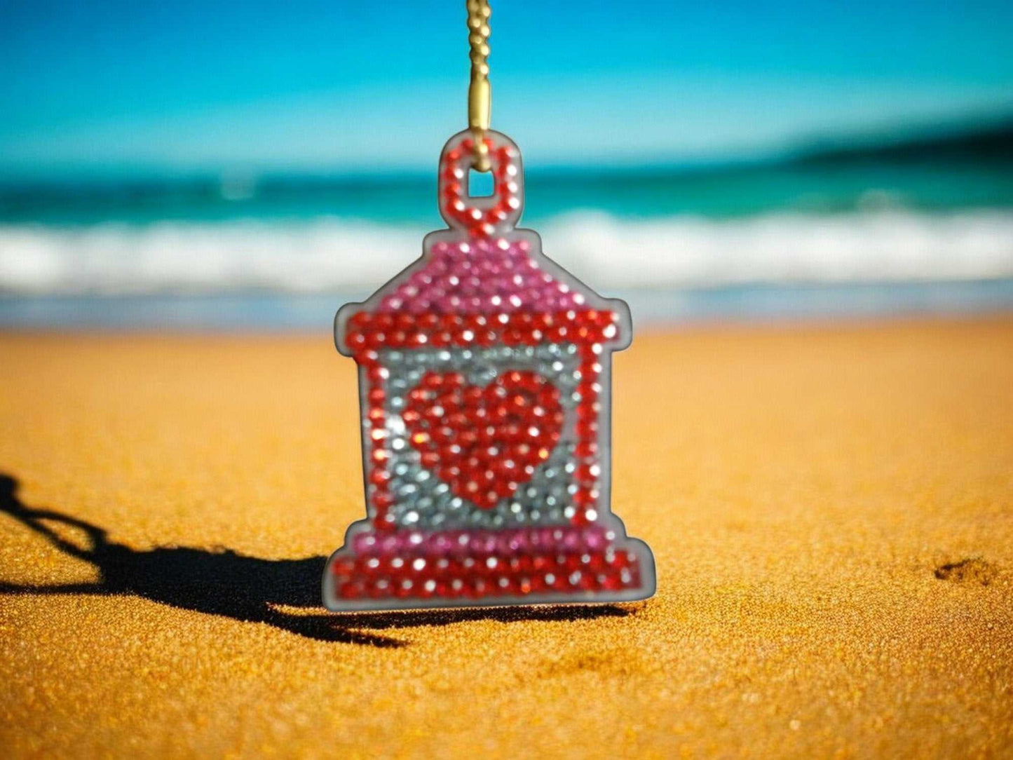 White and red Santa Clause keychain hanging from a wooden surface with a blurred ocean background