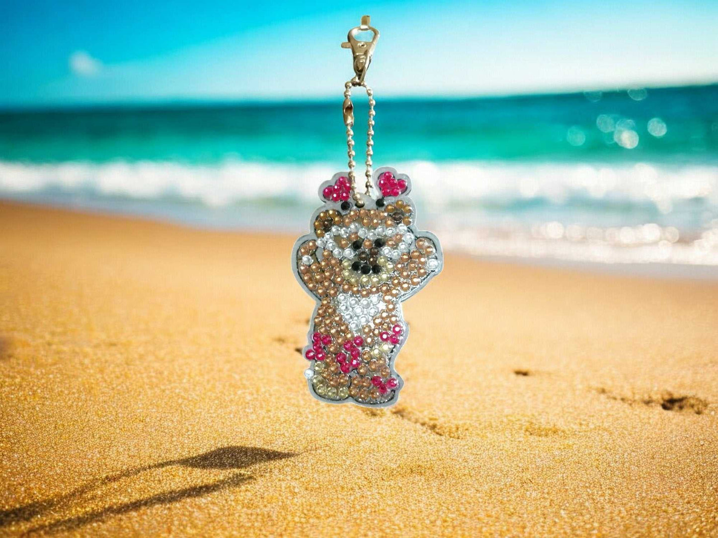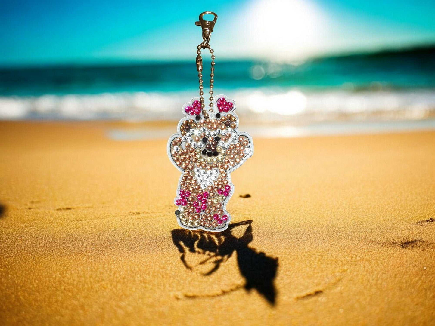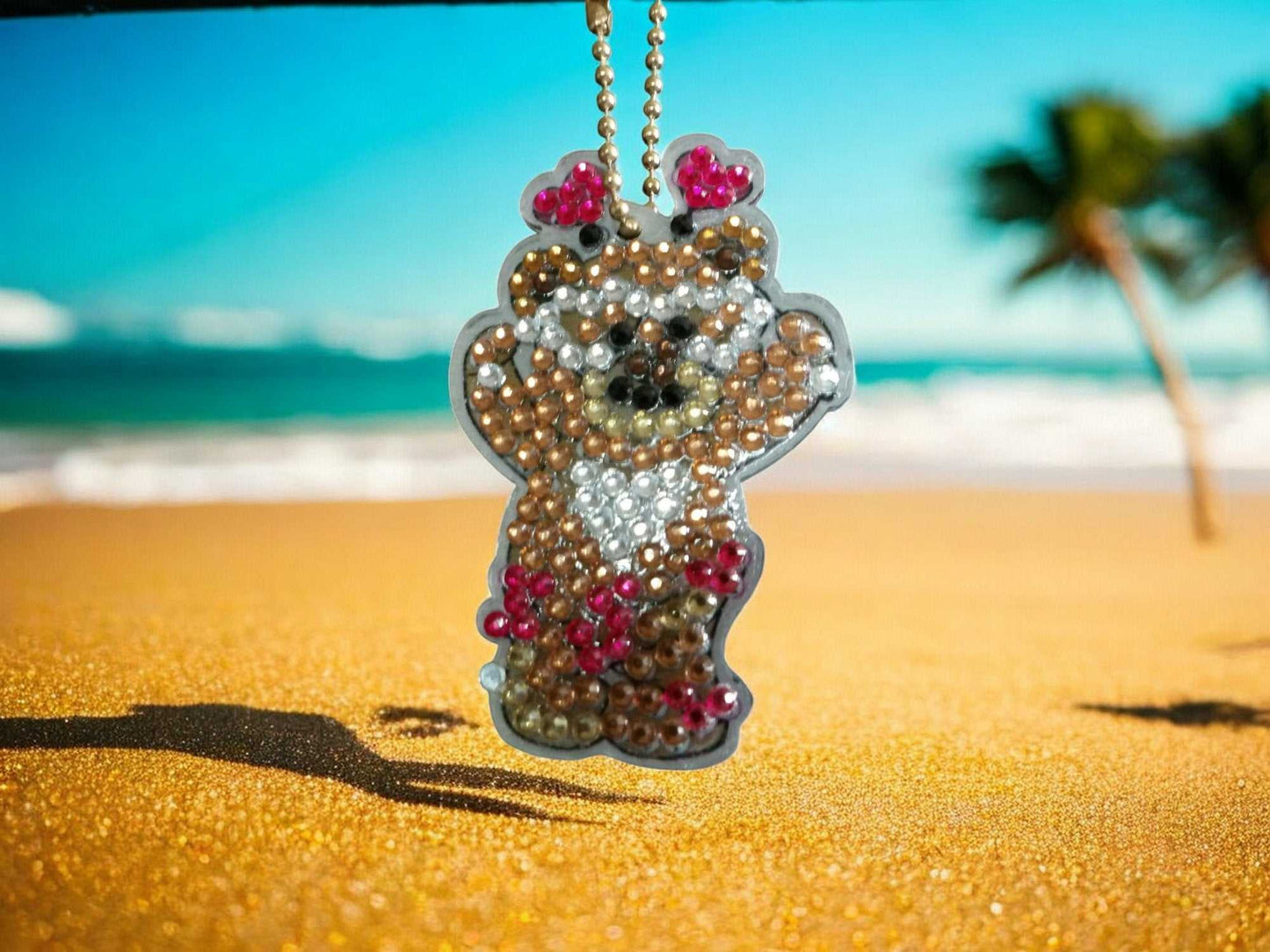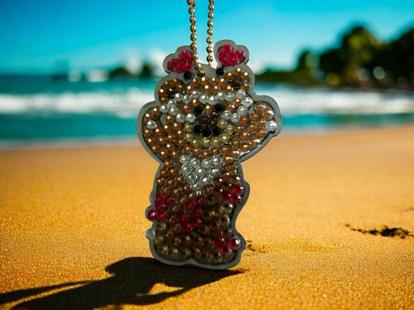 White and red Santa Clause keychain hanging from a wooden surface with a blurred ocean background
