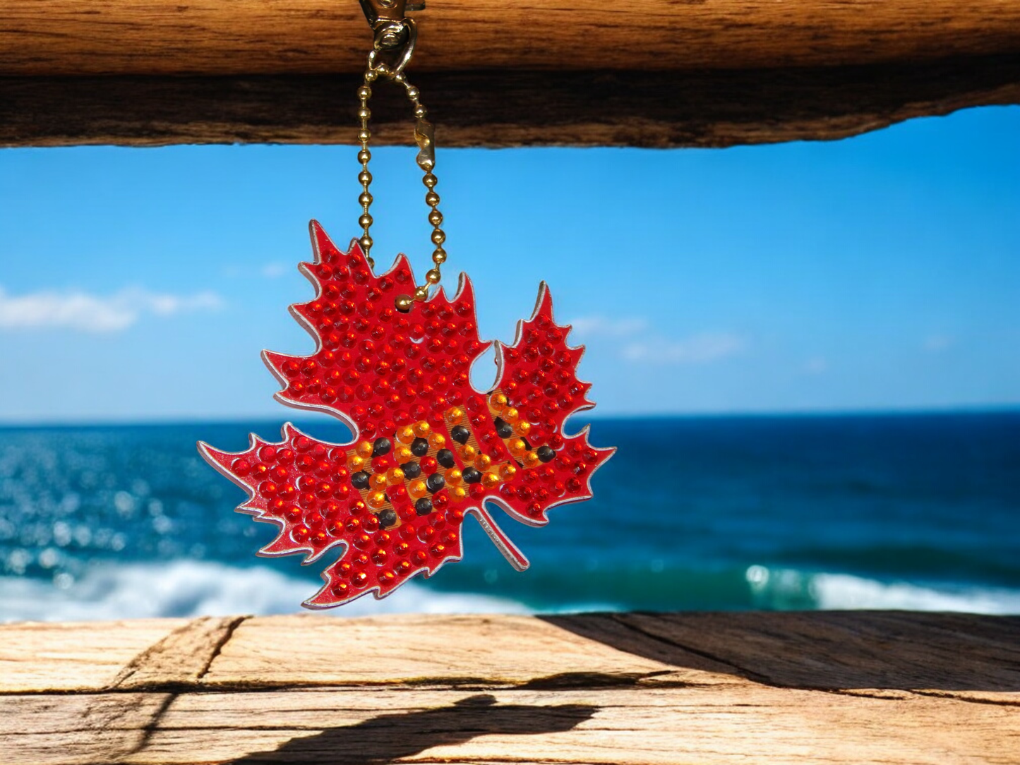 White and red Santa Clause keychain hanging from a wooden surface with a blurred ocean background