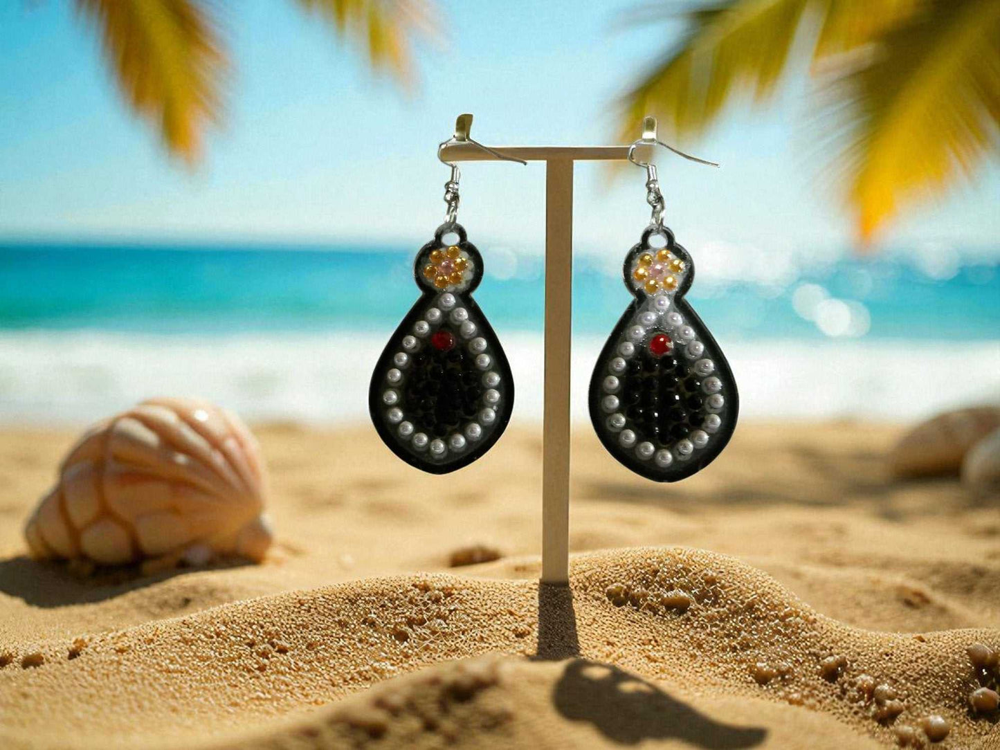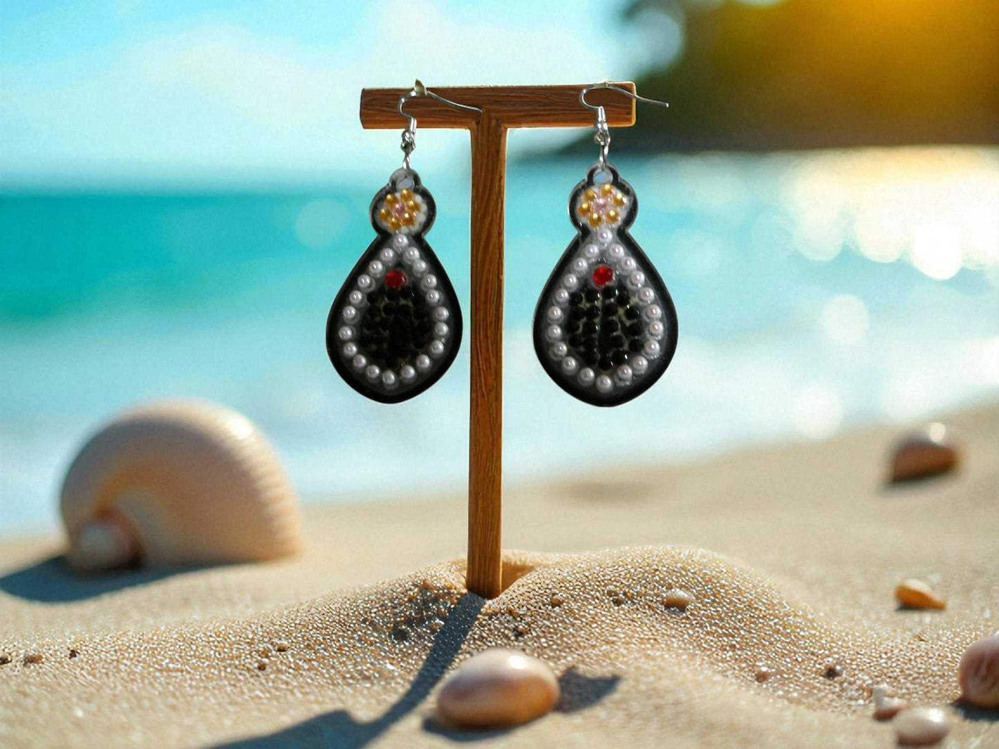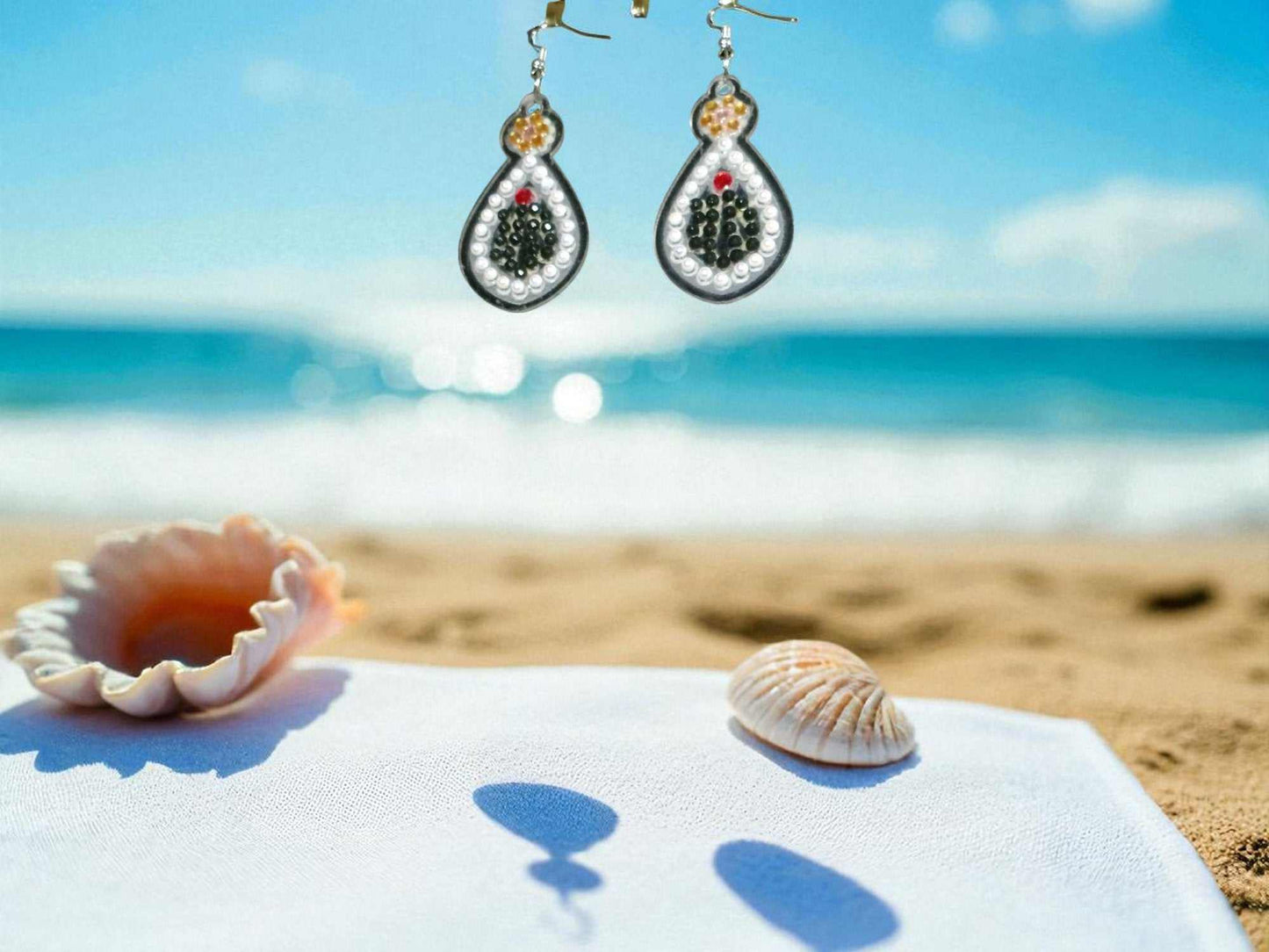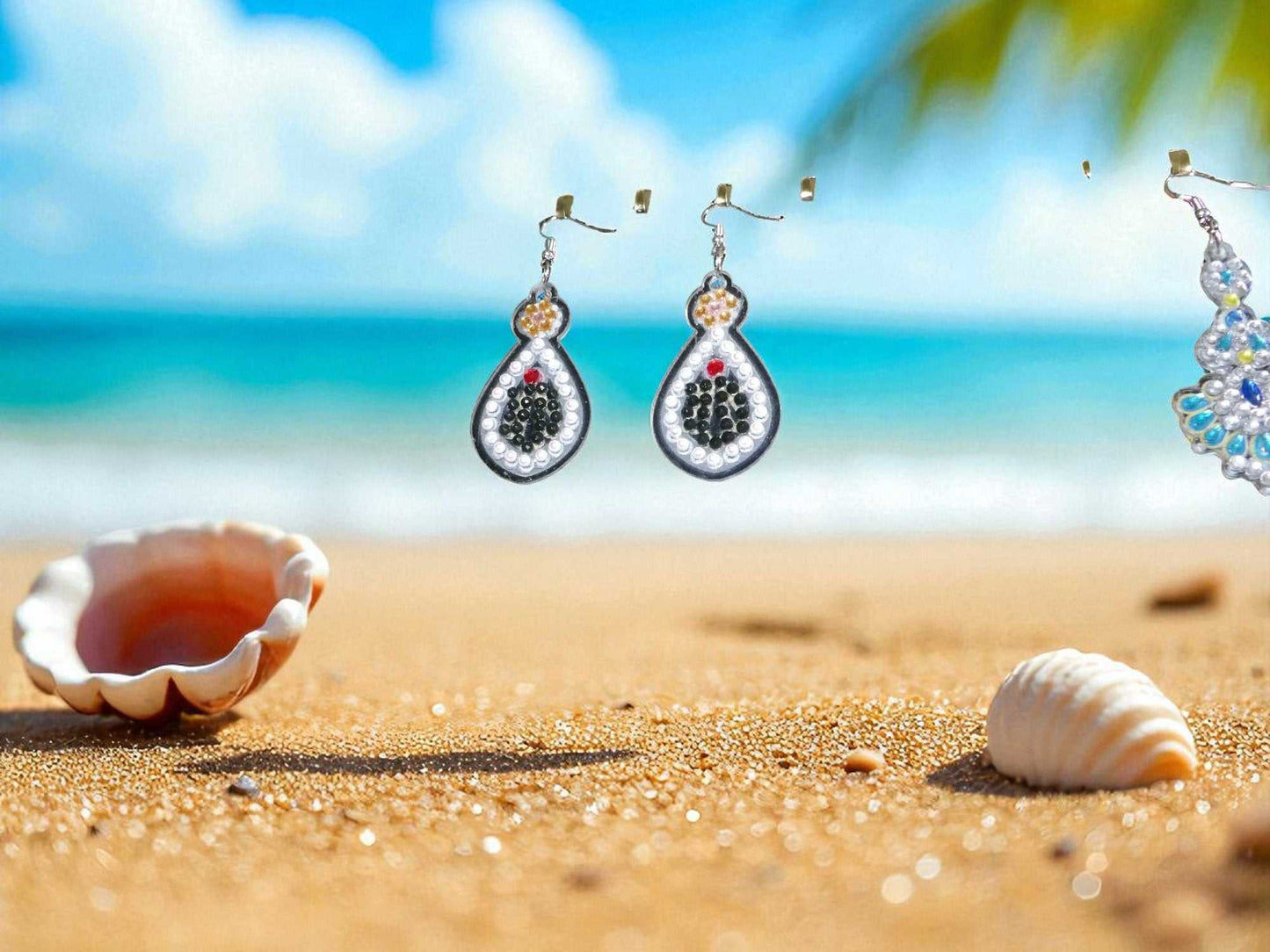 White and red Santa Clause keychain hanging from a wooden surface with a blurred ocean background
