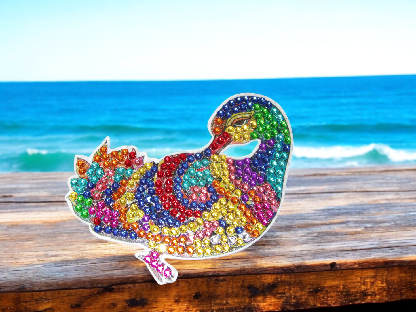White and red Santa Clause keychain hanging from a wooden surface with a blurred ocean background